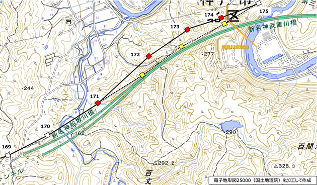 多くの送電線は山間部に建設されています。“新名神高速道路”も山間部を通るということで、送電線と干渉することになりました。具体的には神戸JCT付近の鉄塔7基(鉄塔No.162G1、166、167、171、172、173、174)を動かさなければならない、と。そこで高速道路を管轄するNEXCO西日本から、電力設備を管轄する関西電力送配電を通じて、私たちニュージェックに調査・設計の依頼がありました」。